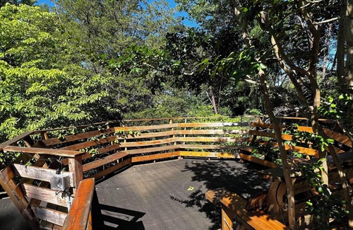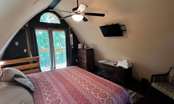 The property features a king-quality air bed for your comfort, as well as shared access to four bathrooms and kitchenettes. You can indulge in delightful snacks that await you in your room. Begin your mornings on the private balcony or gather around the communal fire pit under the stars. The Grand Porch serves as a picturesque spot for outdoor ceremonies, where the gentle sounds of nature enhance the romance of your wedding day. Enjoy the lighted tree house deck that offers breathtaking views and a perfect vantage point to witness both the sunrise and sunset.