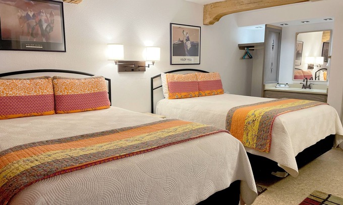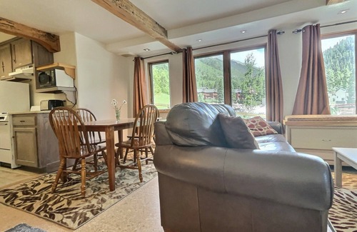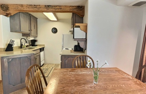 This sweet ground floor ski condo is just 3 minutes walk to lift one at Taos Ski Valley. You'll be the first on the slopes each day, and can pop back to the condo easily for lunch break, or nap time. Cooking is easy in a compact but fully equipped kitchen. The bedroom offers 2 queen beds, Dish TV service and a sliding glass door exit. The living room offers relaxation and entertaining options with a table for 4, couches, gas fireplace and large screen smart TV. It's an easy place to have a wonderful time.