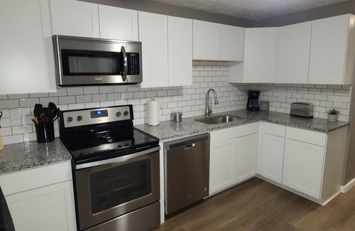 This newly renovated and well appointed home will make you feel like you never left yours. Enjoy each others company in the Open Living/Dining Area. The large kitchen is ready to accommodate a quick bite- or a full on feast. The 3 bedrooms upstairs all have their own Smart Tv. The Lower level has access to the back yard and patio, and also hosts the laundry room, a half bath, and a bonus living area (doesn't comfortably accommodate people over 6 ft in height due to lower ceilings).