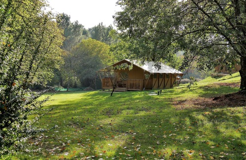 We offer an atypical and unusual gîte in a 50 m2 Safari comfort tent: Fully equipped American kitchen; Bathroom with Italian shower; large living room; TV; Wireless ; large terrace of 15 m2 with large outdoor table, garden furniture and BBQ…). In a 3-hectare park with swimming pool, facing the Béssède forest, in the heart of the Périgord Noir, our estate is located between Sarlat and Bergerac near all the major prehistoric sites and a stone's throw from the Dordogne river.