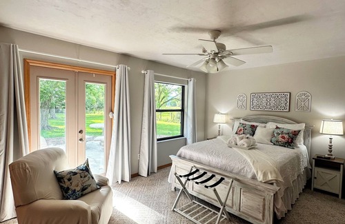 Welcome to this charming farmhouse in Earleton. It’s just a couple of miles to the quaint village of Melrose which boasts the beautiful Lake Santa Fe. With 5 bedrooms including 5 queen beds, 1 king day bed , 1 bunk bed, and 1 queen sofa bed, this terrific property offers plenty of space for guests. Enjoy the 3 bathrooms equipped with a walk in shower in one bathroom and bathtub with shower in the other two bathrooms. The living room space has a king bed day bed for daytime napping, or can be used as a comfortable overnight bed . The large leisure room has two queen bed sleeping stations and a queen sized Lazyboy sofa bed that we will gladly make up for you upon request. There is outdoor seating on the patio complete with a Traeger Grill and fire feature . Our farm is nestled on a pecan grove that has trees that are over 100 years old. This lovely setting will help you feel at home while staying on our picturesque property. Whether you are attending a Gator game, Gator Nationals, Graduations . Lake Santa Fe, or visiting family, the farmhouse will be a memory making destination!