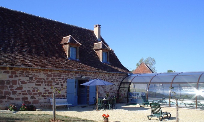 In the centre of the Perigord Noir a beautiful old farmhouse en the typical style if the Perigord, completely renovated, very comfortable and furnished with taste. The farmhouse is situated in a very quiet area and has a covert heated swimming pool that can be opened or closed, just according to your wish.