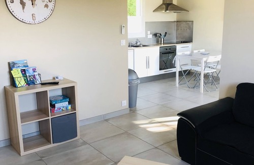 2 bedrooms (1 with 160 cm bed and the other with 2 90 cm beds), living area with sofa + 140 cm BZ, bathroom, fully equipped open kitchen. Covered terrace with barbecue, private garden and parking, pétanque court and games for children.