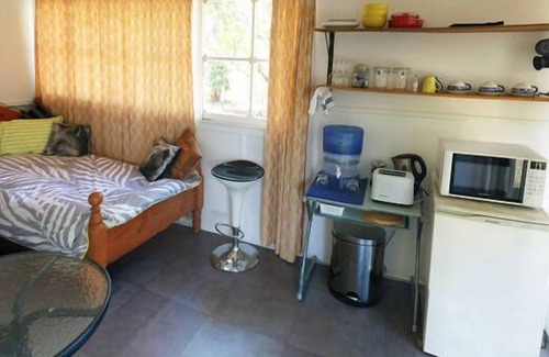In the sleep-out, kitchen appliances include fridge, microwave, kettle, toaster, filtered water. Table & chairs. Basic provisions include plunger coffee, a selection of teas, fresh bread, oats & muesli, home made jams and treats, milk, sugar & butter etc. The fabulous bathroom with huge sunken bath and underfloor heating in the cooler months is across an enclosed verandah.