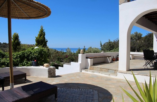 In the south of Crete, close to the very beautiful, long sandy beach of Triopetra, lies the detached, generously built stone house Blue Stone. The holiday home owes its name to the beautiful grey-blue stone of the region from which it is built. Inspired by Cretan architecture, the elevated, two-storey detached house is tastefully furnished. Several terraces with seating areas, some sunny, some shaded by a pergola and a wide view of the sea, invite you to sit, lie down and dream. The well-kept, enclosed garden and natural grounds with olive trees and Mediterranean plants offer further retreats and plenty of space for children to play and run around.