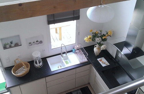 House comprising a large living room with kitchen, storage space in the hallway, 2 large bedrooms with single bed mezzanine, 1 toilet, 1 bathroom with shower, 1 large terrace of 30 m² wooden with 2 sun loungers.