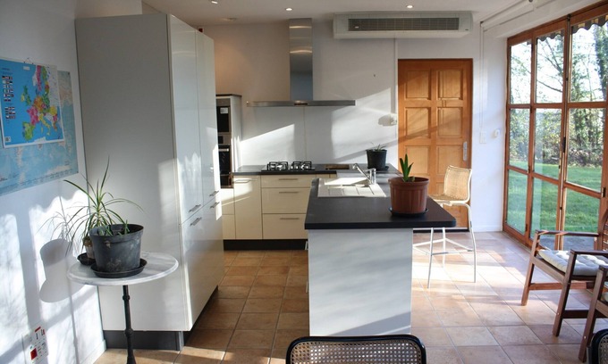Fully equipped kitchen with access and view of the garden, large living room with library and office area, double bedroom, bathroom and dressing room.