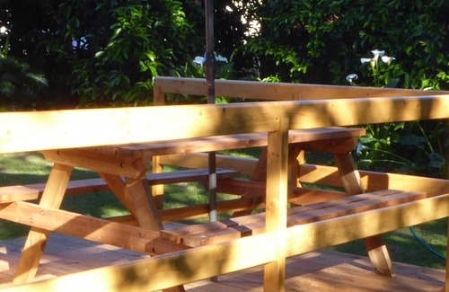 Wooden terrace, with forest table, parasol and barbecue.