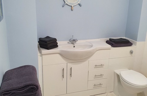 This property has been fully renovated with every comfort for a pleasant stay, It is a modern build spacious flat, Ground floor, wheelchair accessible all on one level, train station 20 second walk with direct access to Glasgow. Lovely quiet area, secure entry, there are two good sized bedrooms one king, one twin can be stored together to make king, both rooms have built in wardrobes and smart TV, one with ensuite shower, there is also a travel cot provided for small child large bright lounge 58" smart TV, with comfortable L shaped sofa and separate double sofa bed, open plan kitchen/dining area, fridge/freezer, dishwasher, washing machine, bathroom with shower, free private parking, USB sockets in all rooms, wifi. Netflix in lounge and bedrooms. Children and pets welcome.