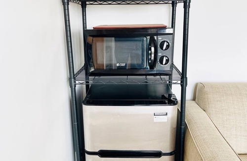 There is a great outside patio to eat breakfast or hang out, full bath, refrigerator, microwave, utensils, plates, cups, tea pot and a coffee pot. There are many amazing restaurants very close by for pick up and delivery but there is not a kitchen in the unit.