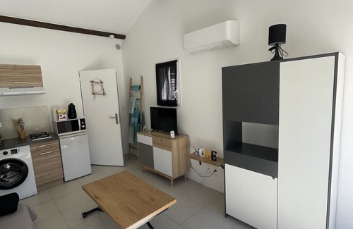 Comfortable studio 5 min from the beach + pool access is located in Biguglia. Comfortable studio 5 min from the beach + pool access provides accommodation, featuring Fireplace/Heating, Kitchen, Air Conditioner, among other amenities. This Apartment features Fireplace/Heating, Kitchen, Air Conditioner, to make your stay a comfortable one.
