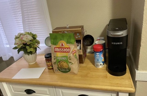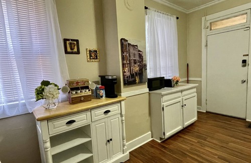 Home away from home for traveling professionals in quaint neighborhood blocks from the Pantry Resturant, Taffy’s for sweets & Banquet Schusters Bakery! This 1 bedroom apartment has so much to offer. The kitchen has a gas range, fridge, crock pot, toaster, rice cooker, & Keurig. The living room has a 55’ smart tv, Wi-Fi, and leather couch. There is a private patio and the yard is made up of wildflowers and succulants. We have Ring motion detected/recording security light/cameras in the front and back entrances with 4 stairs to enter & exit the home.