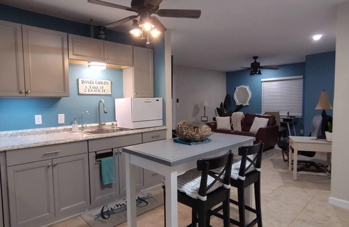 Parking in your separate private shell drive with privacy fence at the entry, gives you a nice feeling of separation from the rest of the house and guests. Courtyard with personal seating area outside your entry with table and 2 chairs, gives a nice serene atmosphere to sip on morning coffee or enjoy a warm balmy afternoon in privacy. We have a gas griddle/Blackstone you may use in your little courtyard area.