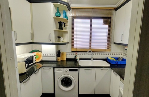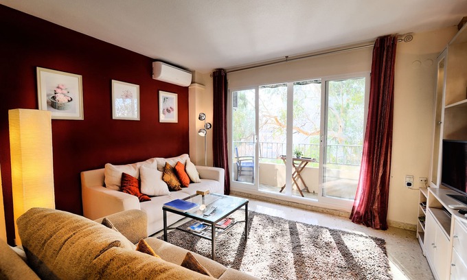 Spacious comfortable full of natural daylight living/dining room with entertainment systems including 32" flat-screen TV with full H.D Netflix & DVD player. Sony micro HiFi stereo input jack for music streamers - best H.D using iPad & with no buffering!. Two comfortable 2-3 seater sofas. Patio doors access southerly 'eye of the sun' balcony. Fringed by a magnificent bird-thronged Red Eucalyptus - listed 'Arbol Monumental' 2018 - overlooking a wide Palm lined avenue. Perfect for sitting out of an evening after sight-seeing. Marbleised tiled floors throughout for summer coolness.