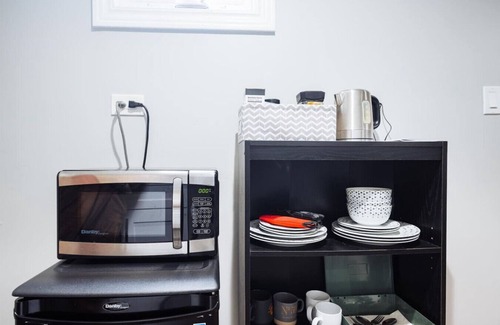 Kitchenette with microwave, sink, mini fridge, and electric kettle and all basic silverware and cupware