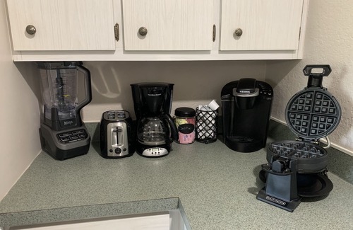 We have included most kitchen amenities (Keurig, regular programmable coffee maker, waffle iron, pots and pans, microwave, toaster, coffee grinder, blender, iron and ironing board). There is a washer and dryer. You will be your own dishwasher for the time being so we supply paper plates and bowls. There are nice ceramic dishes that you can also use. We have included k-pods and sweetener, several spices, some condiments, cooking spray, dish detergent, clothes detergent and dryer sheets, paper towels and toilet paper. You just need to get a few groceries and you will be at home here. All bath towels, bed linens and pool towels are provided. We have a professional cleaning company come in after every listing and they use the best products available to ensure our guest’s safety for a worry free visit. There is a fenced pet area off the screened in pool area for your fur baby to run without a leash.