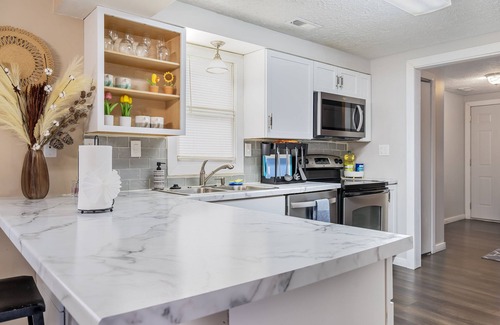 The well-equipped kitchen is ready for your culinary adventures, featuring modern appliances and ample counter space. Whether you're preparing a quick snack or a gourmet meal, you'll find everything you need. Additionally, the nearby main street and shopping areas make it easy to explore local eateries and shops, adding to the overall convenience of your stay.