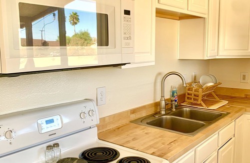 Sleeps 5-6 adults. Inside the main house, one bedroom has a queen bed and air conditioner; the second bedroom has a queen bed and also a futon couch that converts to a full-size bed that sleeps one adult or 2 kids, plus new swamp cooler and air conditioner. Wall unit for heating puts out plenty of heat. There’s also a portable tower heater. Both bedrooms have a view of the mountains, plus, the backyard’s sprawling 400-year-old Tamarisk Tree.