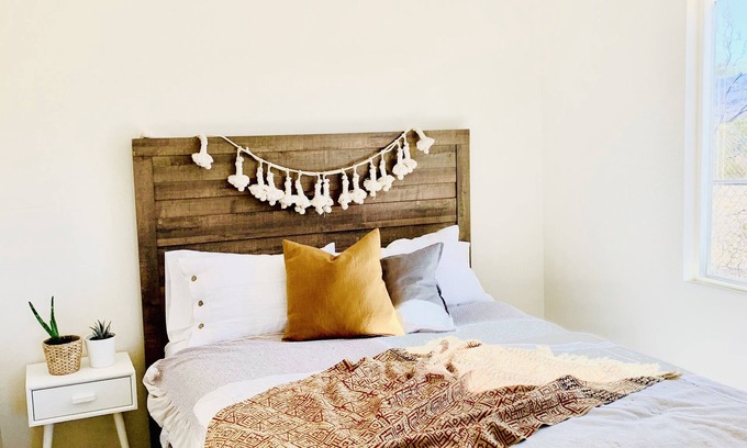Nestled at the edge of the Bartlett Mountains with a southern view of Joshua Tree National Park and the Eastern Mojave, yet only 2 miles from JT’s quaint village, Farmer’s Market and eclectic shops and restaurants, this comfy boho cottage features best of both worlds.
