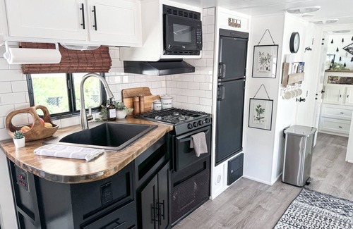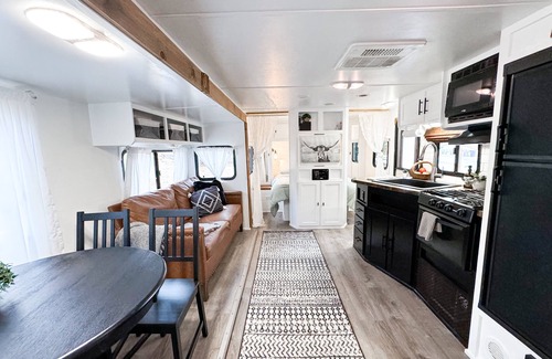 Inside, you won’t believe you’re in a camper. Renovated in 2019 this Comfy+Cozy Camper is exactly that. The sleeping areas have blackout blinds as well as the kitchen window. Cozy up in the queen bed on a 3” mattress topper next to double sconces; perfect for a night read, or cuddle up and watch some TV.