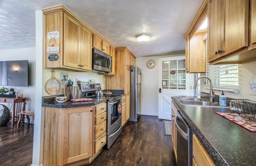The main level of the home features a fully stocked kitchen, which includes a dishwasher, electric range, built-in microwave, toaster over & air fryer, coffee station, dining area, and bar top seating that looks through the living room to the great outdoors. A Smart TV and sound bar offer streaming apps for your entertainment. 3 comfy bedrooms welcome our guests, which feature quality mattresses and linens, luggage racks, charging ports and more. The Full Bath on this level has plenty of linens, a dispenser for shampoo, conditioner & body wash, as well as storage.