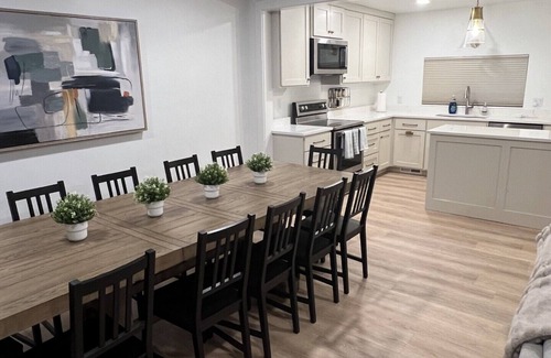 Get ready to relax in this 5-bedroom bungalow in Orem. This lovely property features 3 queen beds and 1 twin bunkbed and 2 triple twin bunkbeds (sleeps 14 total), perfect for a large group of guests. With amenities like WiFi, AC, and a washing machine and dryer, and full appliance package in kitchen, your stay will be comfortable and convenient. The 2 bathrooms are equipped with showers and hair dryers for your convenience. With a large backyard and patio with grill, eating outside is a great option! Conventiently located about 10 minutes to BYU or UVU. Fall in love with Orem and enjoy the magic it has to offer.