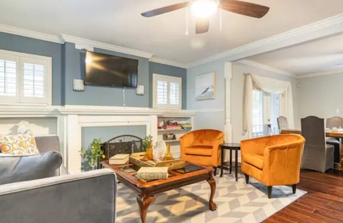 Enjoy this renovated 3 bed, 2 bath home close to all the attractions. Food, entertainment, shopping- all located within miles. If you’re here for business, family, or fun- this home will be your home away from home. Equipped with everything you need-full kitchen, Wi-Fi, flat screen TV in the living room & all bedrooms; dedicated workstation, laundry room, 4 comfortable beds-king, queen, and twin sizes. Enjoy wrap around covered porch, or the backyard with a privacy fence, grill, & patio table.