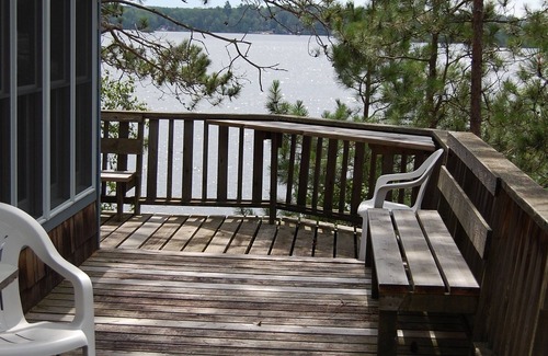 Looking for a beautiful spot for your lake getaway? This cabin sits on a point overlooking Daisy Bay. With three bedrooms (1 king, 1 full, 1 with 2 twins), and two queen sofa beds (one on a private sleeping porch), it can sleep up to ten people. The kitchen is fully outfitted. A deck wraps around two sides of the cabin so you can fully appreciate the beautiful view. There's also a lakeside sauna (shared with one other cabin).