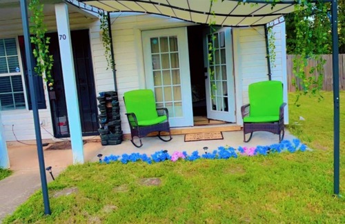 Beautiful comfortable relaxing studio for the maximum of two people ,enjoy the rocking chairs on the porch ,private parking,cold drinks,comfy bed with back lighting..easy self checking an out ,your parking on the left side of driveway,this studio department is exactly what’s shown in pictures ..a small coffee area,bedroom,full bath an the porch area at the entrance which is under the gazebo besides the driveway theres no shared space