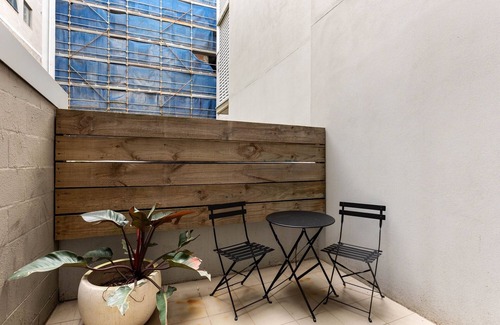 Slide open the doors to the private courtyard—accessed via both the bedroom and living area—furnished with outdoor seating ideal for morning coffees or evening drinks.