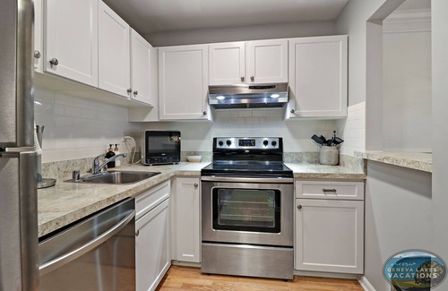 With a fully-equipped kitchen and dining area, this Lake Geneva condo is perfect for weekend escapes or extended stays. Sleeping up to five guests, it features a king bedroom and a queen bedroom with twin futon.