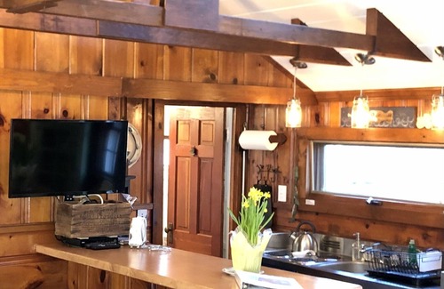 A great traditional knotty pine cottage with inviting living areas highlighted with vaulted wood beamed ceilings, it is appointed with a fully equipped retro kitchen with breakfast bar seating and skylight.