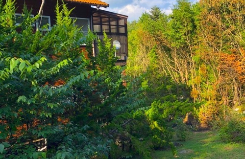 It is a rental villa | cottage | log house built on a mountain surrounded by trees of the Kiso River.