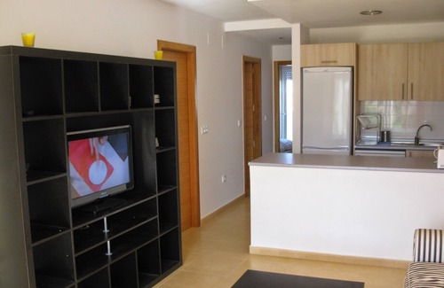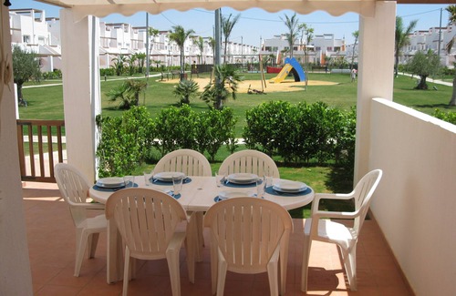 3 bedroom apartment. Porch with private garden. Terrace. Fully furnished and equipped. Air conditioning and free Wi-Fi. Resort with several swimming pools (residents have the right to use all of them), golf, paddle tennis, tennis, soccer field, basketball, etc; Private shopping center with supermarket, restaurants and other stores. The resort is in an enclosed area and has 24 hour surveillance. Located 15 km. from the beaches of Mazarrón, access by highway. Parking space included.