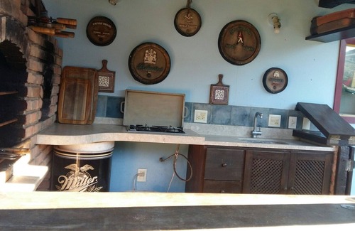 4 suites, three with air conditioning and ceiling fan and one with ceiling fan. 2 toilets, maid's bedroom with bathroom and bathroom, swimming pool, full bar, barbecue, wood oven, balcony, living room and dining room, full kitchen, entrance for three cars, sleeps 12 in comfort and comfort! gated community with security 50 meters from the beach, television in two suites and in the room with Sky 3 TVs, Wi-Fi. Sea view from the master suite.