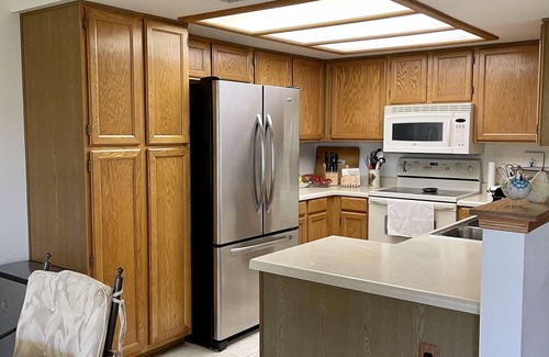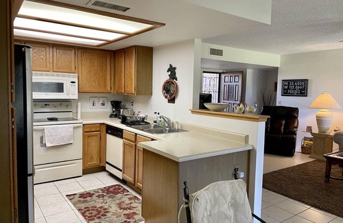 Condo has 2 bedrooms and 2 bathrooms in 1222sf of living space. The master bedroom has an ensuite bath. Both bedrooms have comfortable queen size beds. It has comfortable furnishings and a fully equipped kitchen, patio with BBQ, lounge chairs and outdoor dining set. Two car garage, with washer/dryer. Fast speed internet and large screen TV with many cable, movie and sports channels. The condo is in a guard protected, gated community for guests aged 55+. Condo is right on the golf course with beautiful, relaxing views and it's an easy walk to the club house, restaurant, pool, post office and community/activities center. The condo is only 12 miles to the Mayo Clinic in Scottsdale, AZ.
