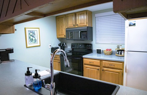 Our perfect mountain getaway on the top floor has been completely renovated from top to bottom with just about everything brand new, including floors, kitchen appliances, dishes, pots and pans, furniture, linens, bedding, etc. This spacious condo can comfortably accommodate up to four guests. Enjoy a cozy fire in the living room or bedroom, as both have wood-burning fireplaces, and both lead onto the private deck through glass-sliding doors to a mountain and waterfall view that is rarely found anywhere!