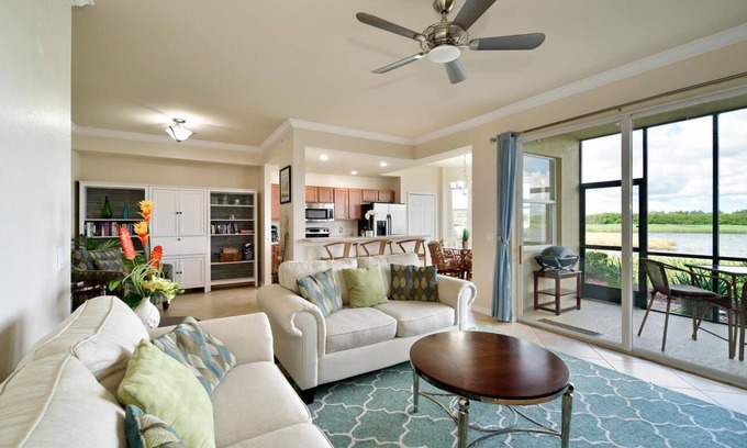 River Strand condo overlooking the 7th hole on Estuary. Stunning views overlooking an active wildlife sanctuary. Enjoy the quiet, serene setting from your kitchen, living room, or screened lanai. You’ll see a variety of birds and ducks at any given moment along with the gator that cruises the lake daily. Catching a glimpse of the occasional otter, white pelicans, or bobcat is a special treat.