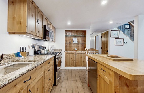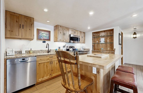 Upon entering, you'll find the main floor with an open living room, dining area, and kitchen. On cold winter nights, you'll want to get comfortable on the big comfy couch and warm up in front of the beautiful gas fireplace. Maybe watch cable on the large flatscreen TV. In the full kitchen, you'll have access to all the major appliances you'd expect, including stainless steel appliances and beautiful granite slab counters. Creating everything from holiday feasts to a big pot of chili to a hearty pancake breakfast before a long day of hiking is no problem here! Right off the living room is a small deck with a gas grill for fixing up burgers, chicken, or whatever you're in the mood for. From this level of the condo there's not much of a view, but the deck is still nice for enjoying the crisp mountain air or having a glass of wine outside after dinner.