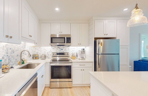 The bright new kitchen is a chef's dream, featuring an island that seats four, white Shaker cabinets, quartz countertops, mosaic tile backsplash, and wonderful lighting. As you sit at the island, you can even catch a glimpse of the ocean reflected in the mirror, adding a touch of magic to your dining experience.