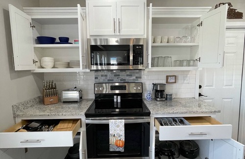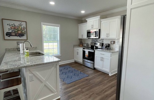 In a small town in the south, where the Okefenokee Swamp runs deep and railfans thrive, the Conductor’s Corner stands out. The Conductor’s Corner is a quaint 1,100 sqft cottage, originally built in 1925 and recently remodeled to entertain guests of Folkston, GA. The 2 bedroom, 1 bathroom home is located adjacent to the train tracks and neighbors the Folkston Railfan Train Platform. The open floor plan in the living and kitchen areas welcome guests with all the comforts of home. The master bedroom is equipped with a luxurious king sized bed and the secondary bedroom has two full beds. The updated bedrooms are adjoined by a jack & jill bathroom with a double vanity. The back porch has seating for a night of watching trains under the stars, while enjoying dinner from the provided grill.