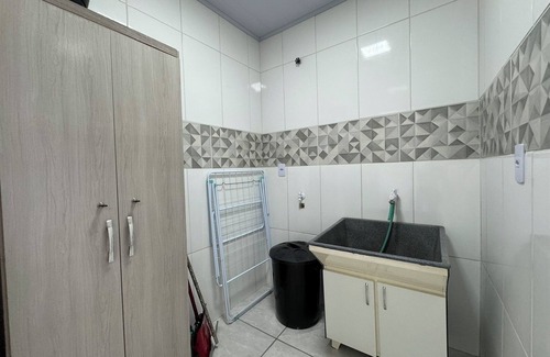 -Área de serviço equipada com tábua, ferro de passar, varal de chão e tanque de cimento.