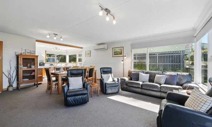 The open-plan kitchen, living, and dining area is the heart of the home. Unleash your inner chef in the fully equipped kitchen, then gather around the generous 8-seater dining table for feasts and game nights. Sink into the lounge's three recliners or the cosy sofa for movie marathons on a rainy day (thanks to the huge DVD collection).