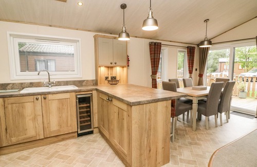 The living areas in this single-storey lodge consist of an open-plan kitchen, dining area and sitting area with an electric Range oven, gas hob, microwave, fridge, freezer, dishwasher, wine cooler, TV, and electric fire. The bedrooms consist of a king-size with en-suite and TV, and a twin with TV, along with a bathroom. Outside there is an enclosed wrap-around veranda with decking and furniture, and off-road parking for two cars. One well-behaved dog welcomed, but sorry, no smoking. You'll find a shop in 0.9 miles, a pub on-site and Pine Lake in 1.4 miles. WiFi, fuel, power, bed linen and towels are all included in the price. Coniston View 9 is an idyllic location to explore the coast and country of Lancashire. Note: There are steps to the exterior of the lodge.