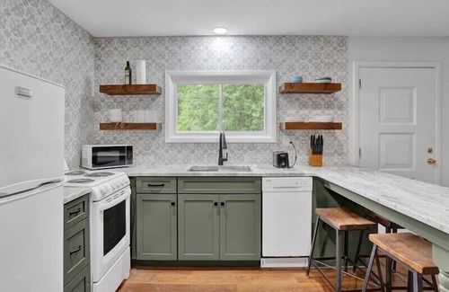 Walk into a beautiful, open coffee and lounge area, ideal for having a morning cup of coffee or an evening cocktail. Then you'll see an open modern kitchen with an oven, dishwasher, and all the tools to make a delicious meal! Walk into the cozy living room with original hardwood floors, a decorative stove, and a brand new smart TV. There are two comfy bedrooms with a queen and full bed, and big fans above them for those warm summer nights. The updated bathroom has a full tub.