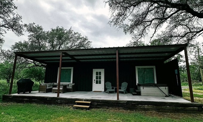 This is a one-of-a-kind container home that blends modern farmhouse charm with cozy comfort. Inside, you’ll find a spacious one-bedroom, one-bath layout with thoughtfully designed details throughout. The living area includes a full-size pull-out couch, making it ideal for couples, small families, or a few friends. Whether you're lounging indoors or settling in for a restful night's sleep, you'll feel right at home. Step outside to your private covered back porch, where you can sip your morning coffee, unwind in the evening, or enjoy a soak in the hot tub under the stars. There’s also a grill for outdoor cooking—perfect for a laid-back BBQ or romantic dinner. This is more than just a place to stay—it's a place to relax, recharge, and experience something truly unique