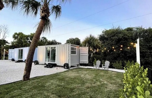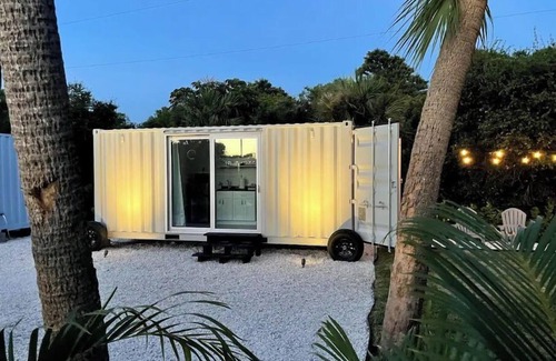 One of two luxury 20ft shipping containers within a resort style property. This cozy unit features a Full Xl bed, TV, kitchenette, and full bathroom. Enjoy outdoor sports on your private pickelball/basketball court or lounge in the oversized pool and hot tub. Property is located minutes from the beaches, downtown Jensen Beach, Hawks Bluff State Park, shopping, as well as fine dining. This property is truly a secluded paradise.