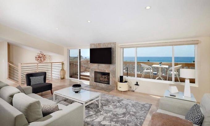 Whether you're sitting on the covered patio enjoying breakfast or a sparkling sunrise, relaxing in the cozy living room enjoying the fireplace and the ocean views, or on the lovely west facing deck overlooking the ocean taking in the panoramic view of the Ocean or a gorgeous sunset, the Pacific Ocean is yours to enjoy every day with picture perfect views! No details were overlooked in the complete and total 2016 remodel of this elegant and contemporary designed 1,544 square foot , 2 bedroom/2.5 bathroom Townhouse with spectacular ocean views. The high quality complete remodel/rebuild by the Interior Designer of this Townhouse features all new electrical, plumbing, windows and doors, walls, ceilings, lighting, all new kitchen and bathrooms, raised ceilings, and all new stainless steel Bosch appliances in the kitchen, independently controlled and programmable air conditioning in each of the two bedrooms and in the living area on the second floor, and a laundry with washer and dryer. All of the furniture, linens, towels, mattresses, and furnishings throughout the Townhouse are also new. The property is fully supplied with a stock of all paper goods (paper towels, toilet paper, tissues, etc.), laundry soap, hand soap, etc. In short ... everything is new, clean, contemporary in design, spacious, and very comfortable!