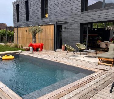 Contemporary architect's house, pool, jacuzzi offers accommodations in Deauville, 2 miles from Deauville Casino and 2.2 miles from Promenade des Planches. This property offers access to a balcony, free private parking, and free Wifi. The villa has an outdoor fireplace and a sauna. With direct access to a terrace with garden views, the spacious villa consists of 1 bedroom. The air-conditioned villa also offers a flat-screen TV, a fully equipped kitchen with a minibar, a seating area, washing machine, and 4 bathrooms with a hot tub and a bath. For added privacy, the accommodation features a private entrance. There is an on-site bar. The villa also features an outdoor swimming pool and a hot tub for guests to relax in. Guests at Contemporary architect's house, pool, jacuzzi can enjoy walking tours nearby, or make the most of the garden. Trouville-Deauville SNCF Railway Station is 2.4 miles from the accommodation, while Port Morny is 2.5 miles away. Deauville - Normandie Airport is 3.7 miles from the property.
