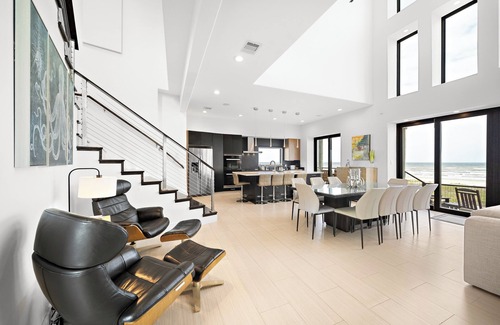 3200 square feet of beachfront contemporary luxury await you on the quiet west end of Galveston island. The home is located directly on a strip of beach where vehicle traffic is restricted during the busy summer season, so you can enjoy a secluded beachfront stay. Our home is bright, spacious, modern, and has waterfront views from every room. It was built with no expense spared with top line appliances, flooring, HVAC, and a master bath with a 6 head steamer shower and large tub with a view of the surf while you soak. There are 3 bedrooms and a loft with a fold out couch. Each bedroom has its own full bath and private deck that opens out to the beach. The loft has large picture windows that face the surf as well. There is an additional separate full bath upstairs and a half bath on the main level to easily accommodate all.